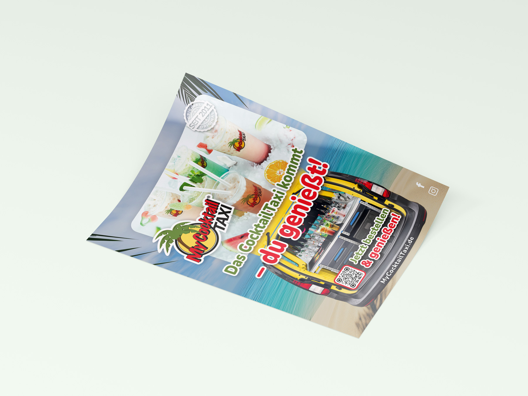 Die Kombination aus professionellem Layout, QR-Codes und effektiven Preisnachlässen macht das Printprodukt zu einer leistungsstarken Marketinglösung für MyCocktailTaxi.
