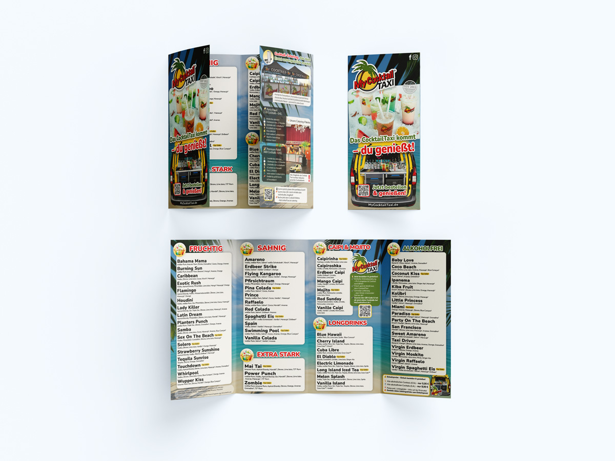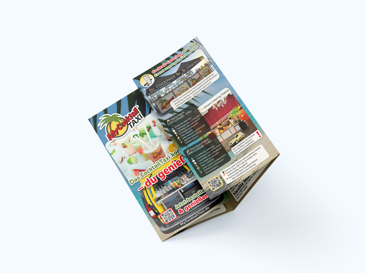 Für MyCocktailTaxi wurde ein moderner und ansprechender 4-seitiger Wickelfalz-Flyer entwickelt. Dieser dient als kompakte und informative Werbemaßnahme, um Kunden das Cocktailtaxi-Konzept, das Sortiment und besondere Angebote näherzubringen.