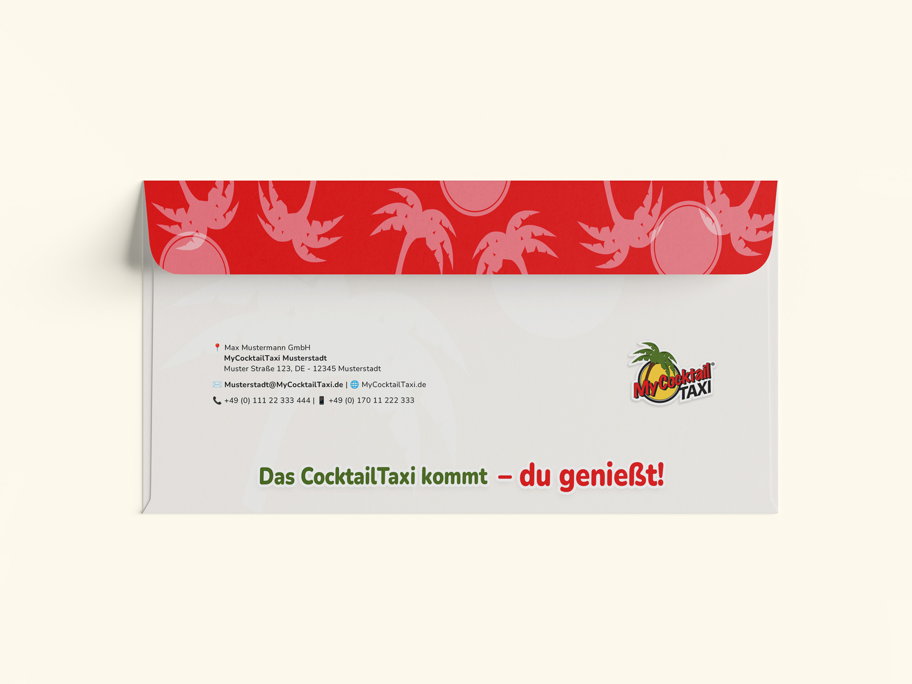 Für MyCocktailTaxi wurde ein hochwertiger Marken-Briefumschlag gestaltet, der die Corporate Identity auch im geschäftlichen Schriftverkehr widerspiegelt. Das Design verbindet Funktionalität mit einer klaren Markenbotschaft und sorgt für einen professionellen, einheitlichen Auftritt.