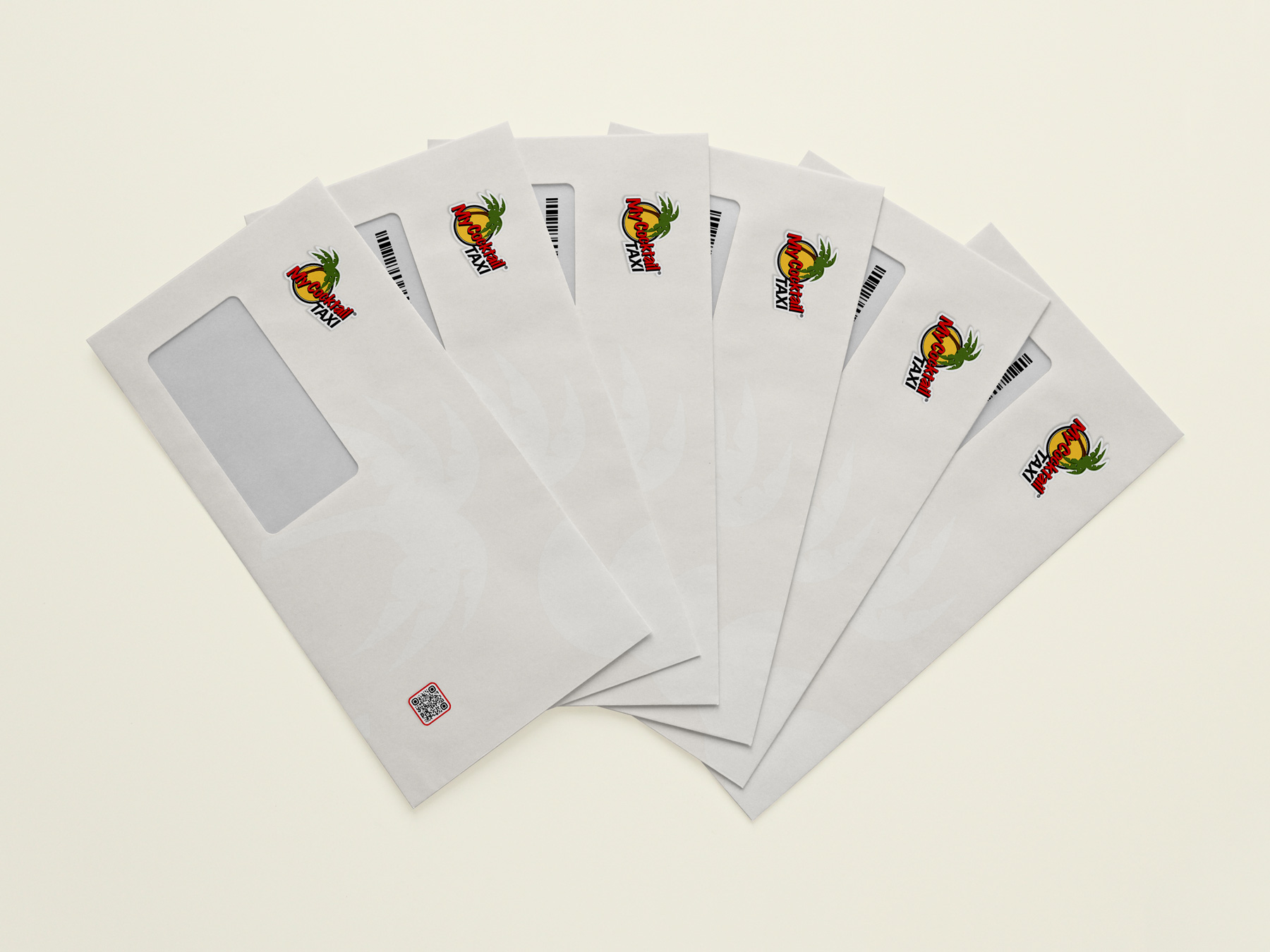 Das Briefumschlagdesign für MyCocktailTaxi kombiniert Professionalität mit Wiedererkennung. Durch das dezente Palmenmuster, den individuellen roten Verschluss & die QR-Code-Integration wird der Umschlag zu einem hochwertigen Branding-Element, das sowohl funktional als auch optisch überzeugt.