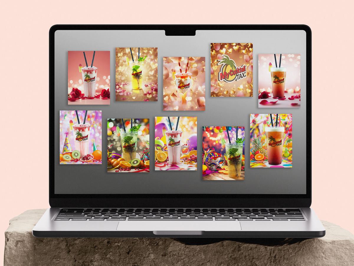 Für MyCocktailTaxi wurden hochwertige, textfreie Social Media Vorlagen entwickelt, die für verschiedene Plattformen wie Instagram, Facebook oder Pinterest genutzt werden können. Durch die Kombination aus ansprechenden Farbwelten, saisonalen Motiven und der Markenidentität von MyCocktailTaxi lassen sich diese flexibel mit Texten oder Call-to-Action-Elementen ergänzen.