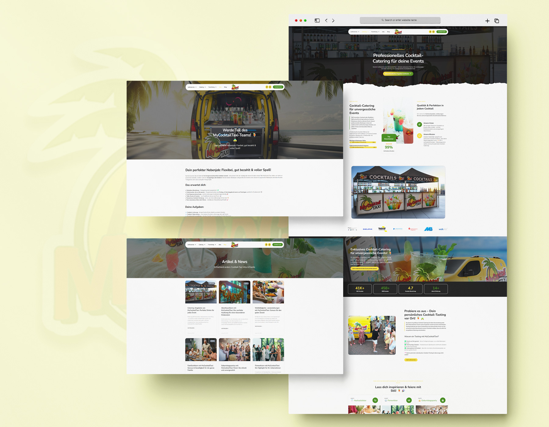 Das neue Webdesign für MyCocktailTaxi bietet eine professionelle, userfreundliche & markenkonforme digitale Präsenz. Durch klare Call-to-Actions, intuitive Navigation & visuelle Konsistenz mit den Print- & Branding-Materialien wird die Online-Kommunikation auf ein neues Level gehoben.